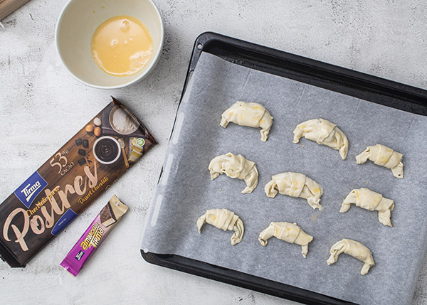 Con el huevo batido pinta la parte de arriba de los croissants y hornea durante 15 min, esto dependerá de tu horno y vigila cuando estén dorados estarán listos.