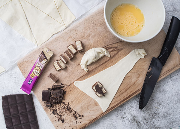Corta en trozos las Ambrosías y el chocolate, y colócalo en la parte ancha del triángulo y empieza a enrollar por esa parte hasta enrollar toda la masa y repite con todo los triángulos.