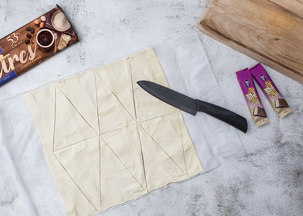 Para comenzar precalentamos el horno a 200 ºC y cortamos la masa con un cuchillo creando triángulos alargados.